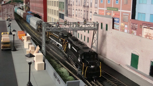 1/87th scale Sir Neal is manning the front platform on E.B.R.R. #7278 and watches UKP-2 arrive at Terminal Yard while his train, EC-3, is building up air pressure.