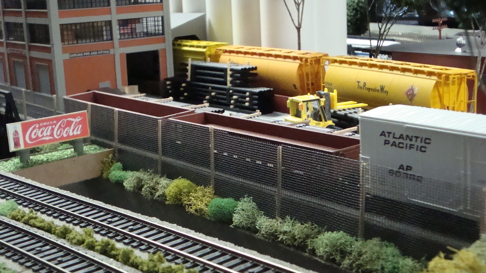 Newly minted conductor 1/87th scale AT JOE is manning the rear platform and protecting the shove move towards the East Side. Over at Empire City Caterpillar it looks like that refurbished excavator is ready for shipment back to Sal's Salvage in West Mill NY.