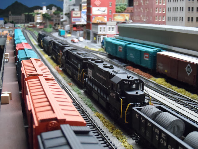 Then on a rainy late February Sunday I hit the train room and spent an enjoyable day putting together some 5 and 6 unit consists to power my freight trains. I focused on getting the Steel Products Train to Terminal Yard and then to North Side yard for interchange with the Long Island RR. I didn't have to worry about excessive fuel consumption or locomotive shortages like the Penn Central. Although I think my house lights were dimming with some of the older engine lash ups!