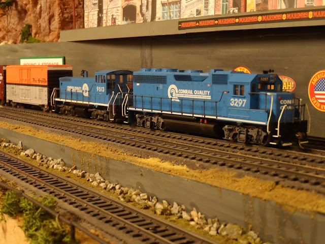 We open today's short post with a six car Conrail lash up featuring an EMD GP30 and F7A still in Penn Central paint. The four Conrail painted units are powered locomotives from Mantua. The PC units are a dummy units from Athearn and Bachmann respectively.