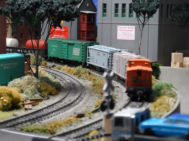 A short time later Senior Engineer Sir Neal pulls a cut of PCCM freight cars out of North Side Yard. EBRR 7279 is sold by Walthers as a GP9m but we're imagining it is a GP18, the non turbo charged cousin of the GP20.