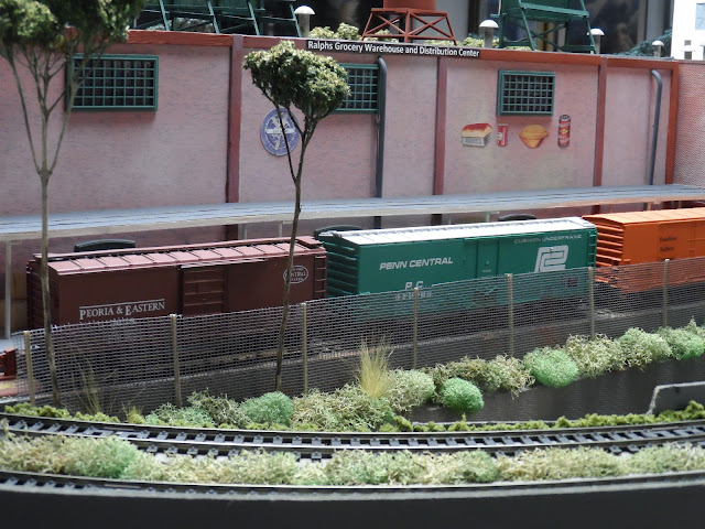 Four PCCM freight cars are spotted at Ralph's Grocery Warehouse. BAR 7574 and the orange HRC boxcar are loaded with baked goods from Freihofer's Bakery in Rock Ridge, NJ.