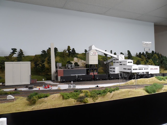 A Cement Plant is open for business. Note the HVAC vent. The room was very comfortable and having heat and a/c in Georgia is a good idea.As you can see Randall's layout is huge occupying most of his basement. In a word I would compliment it as "tight". Meaning it looks great in its present state and I appreciated how the railroad and trains flowed around the room on 3.5 levels. The construction, track plan, track laying, wiring, structures, scenes, rolling stock and motive power was "tight".