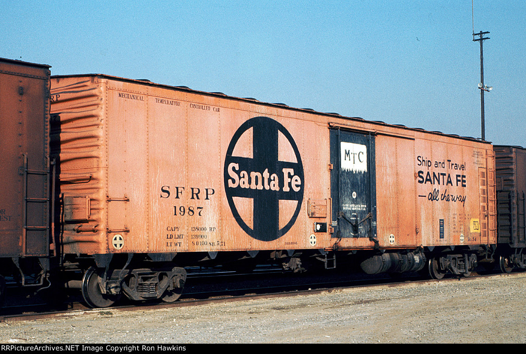 A close up of the SFRP 2194 showing the large ATSF herald with Mechanical Temperature Control Car in small writing to the left. Note the vents for the refrigeration unit to the left. SFRC 51398 is a rib sided car with pretty much the same paint and lettering that includes the ATSF Ship and Travel SANTA FE all the way slogan.